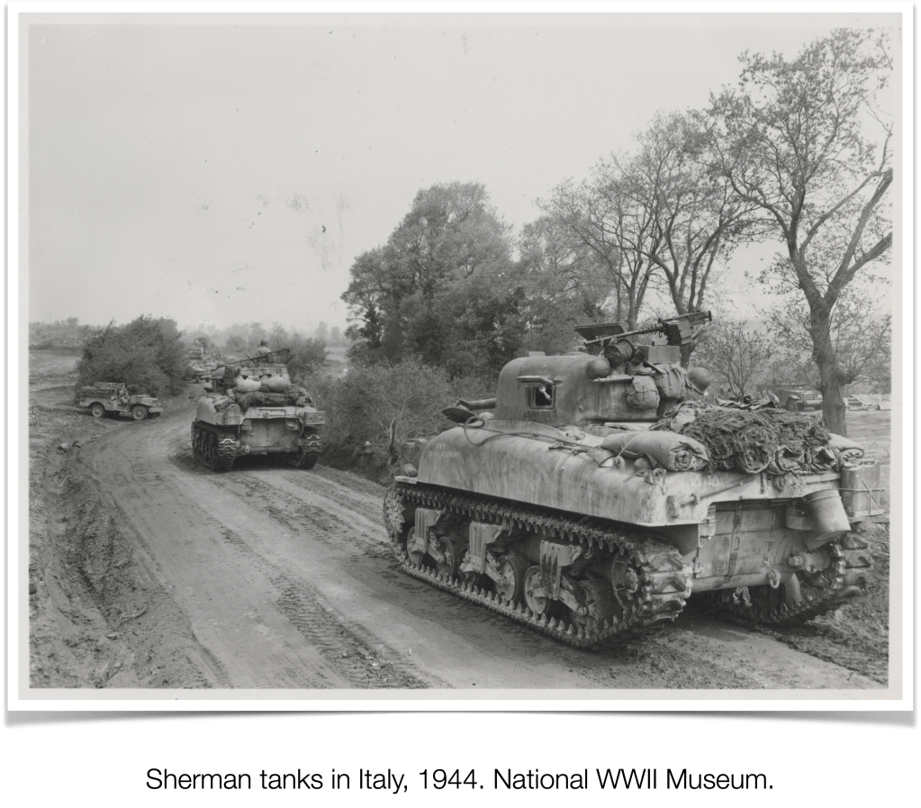 Two of the 3rd Division tanks come right by my foxhole. There were a lot of 3rd Division tanks, and the Krauts on the mountains threw everything from 20mm to 88mm cannons at them, especially a lot of mortars and some “screaming meemie” shells.