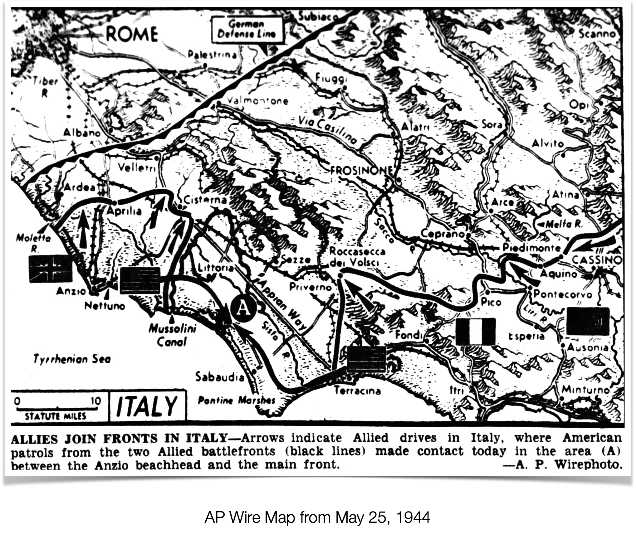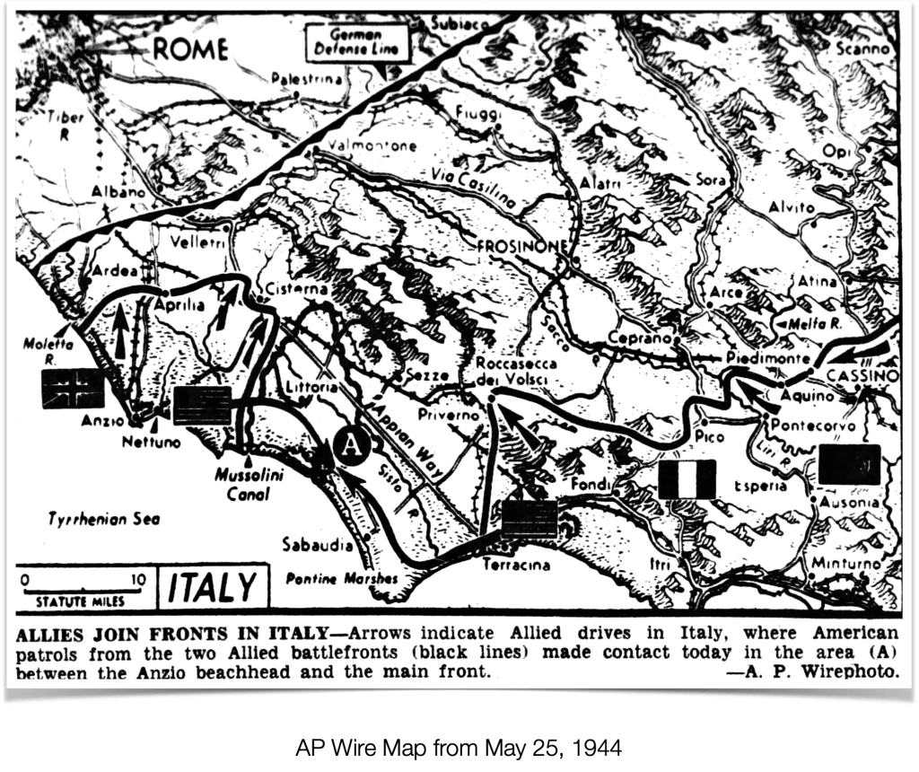 - Preparations were underway on May 21-22 for “Operation Buffalo,” the Allied attack to breakout of the stalemate, and the 3rd Infantry push toward the German held town of Cisterna. There were likely a lot of messages being couriered to various CPs. ↩︎