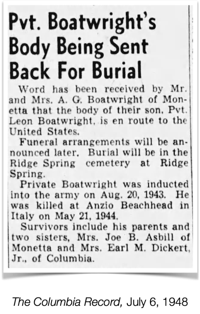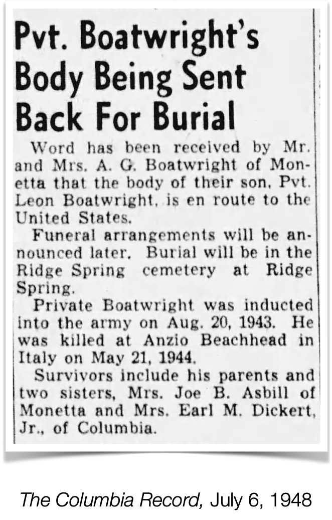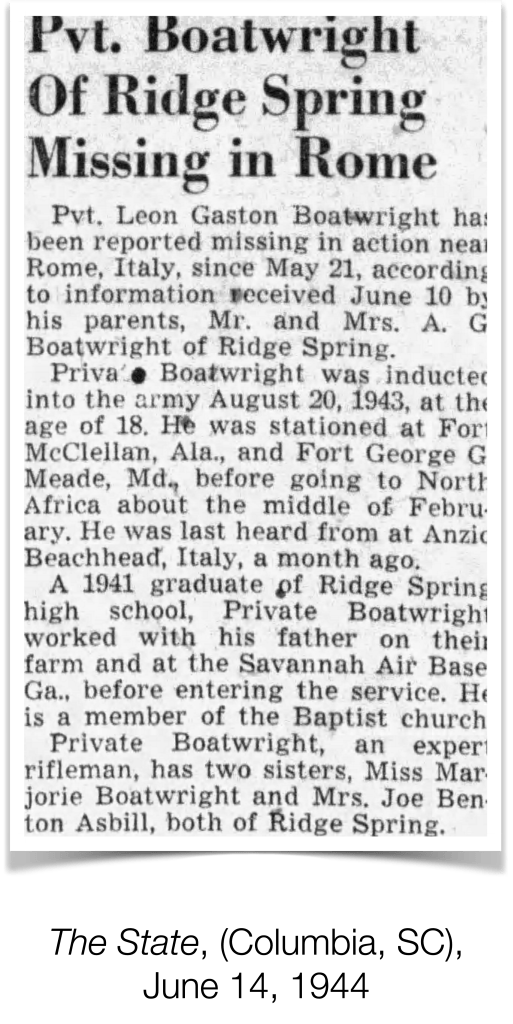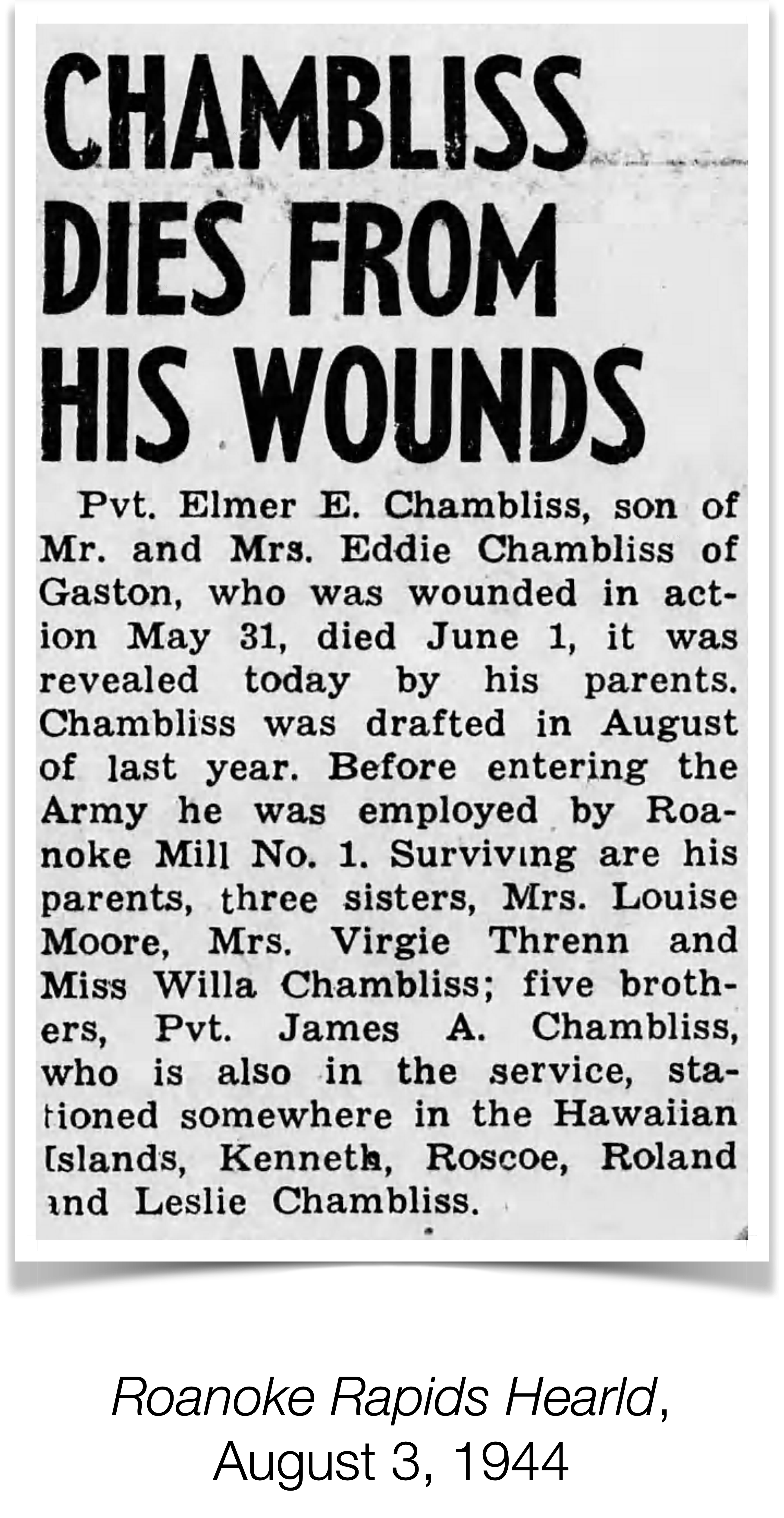 - U.S. WWII Hospital Admission Card Files record Chambliss’ death in June, 1944 from “Artillery Fragments.” The files cite Crider as being wounded in May, 1944, “Causative Agent: Bullet, Machine Gun.” He was discharged in June. I corresponded with Crider’s daughter in June, 2023, and she corroborated his being wounded as Dad described. Exactly when Boatwright is killed is uncertain. He is reported missing “since May 21.” I have been unable to find any records on Red Hendricks. ↩︎