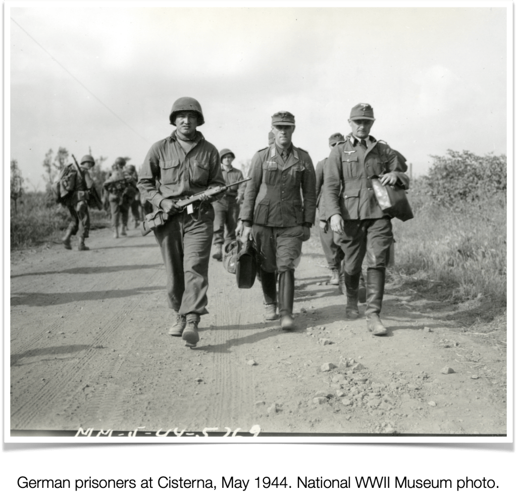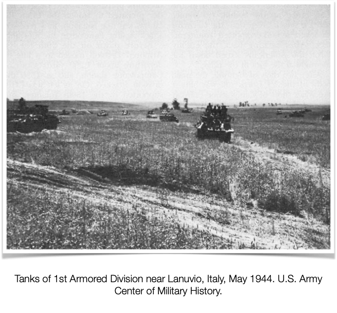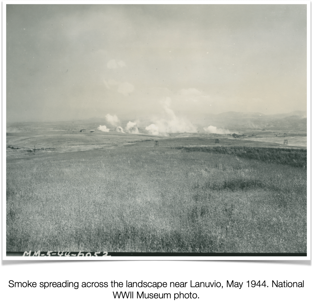 - From the Narrative History of the 133rd Infantry: “On 1 June 1944 the regiment continued its attack toward Lanuvio. The enemy had a well established defense line with well established dugouts and camouflaged gun emplacements. The 3rd Battalion was the point in the assault which progressed slowly against heavy machine gun, mortar, self-propelled artillery, and small arms fire. The 3rd Battalion was relieved by the 1st Battalion and hastily reorganized.” ↩︎