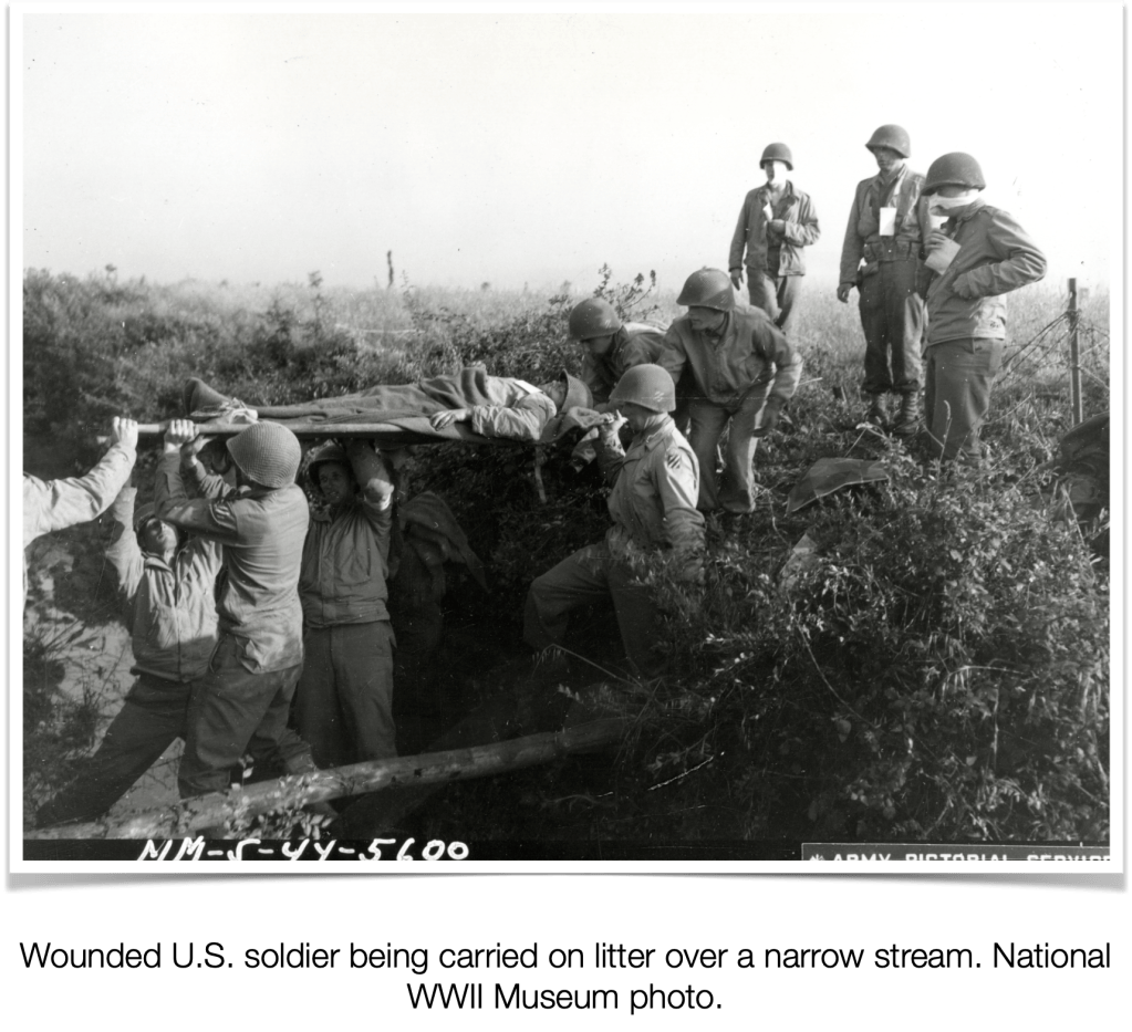 We moved forward slowly, several times we were pinned down by enemy machine gun fire, but our machine guns, mortars, and artillery managed to drive them back each time. About 10 am, an 88 shell landed between Friedlander and the man in front of him. Friedlander and the other fellow were covered with dirt, but not hit. They were shocked and had to be sent back to an aid station. The boy in front of Friedlander was hysterical and crying when they brought him by me. Friedlander was in front of me, so when he and the other guy went back the sergeant passed the word back, “close it up,” so I moved up to take their place in the line.