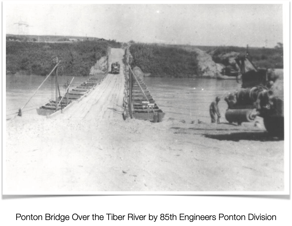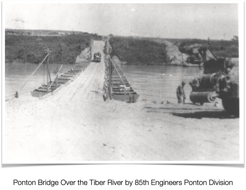Later in the day we came to the Tiber River in Rome and had to wait several hours while our engineers built a pontoon1 bridge across the river. The Germans had destroyed the bridges before we got there.2 After crossing the Tiber River, we continued advancing north through Rome. In the evening we went into a large vineyard and were told to dig in. I proceeded to dig a prone shelter laying the dirt on the enemy side of the hole.
