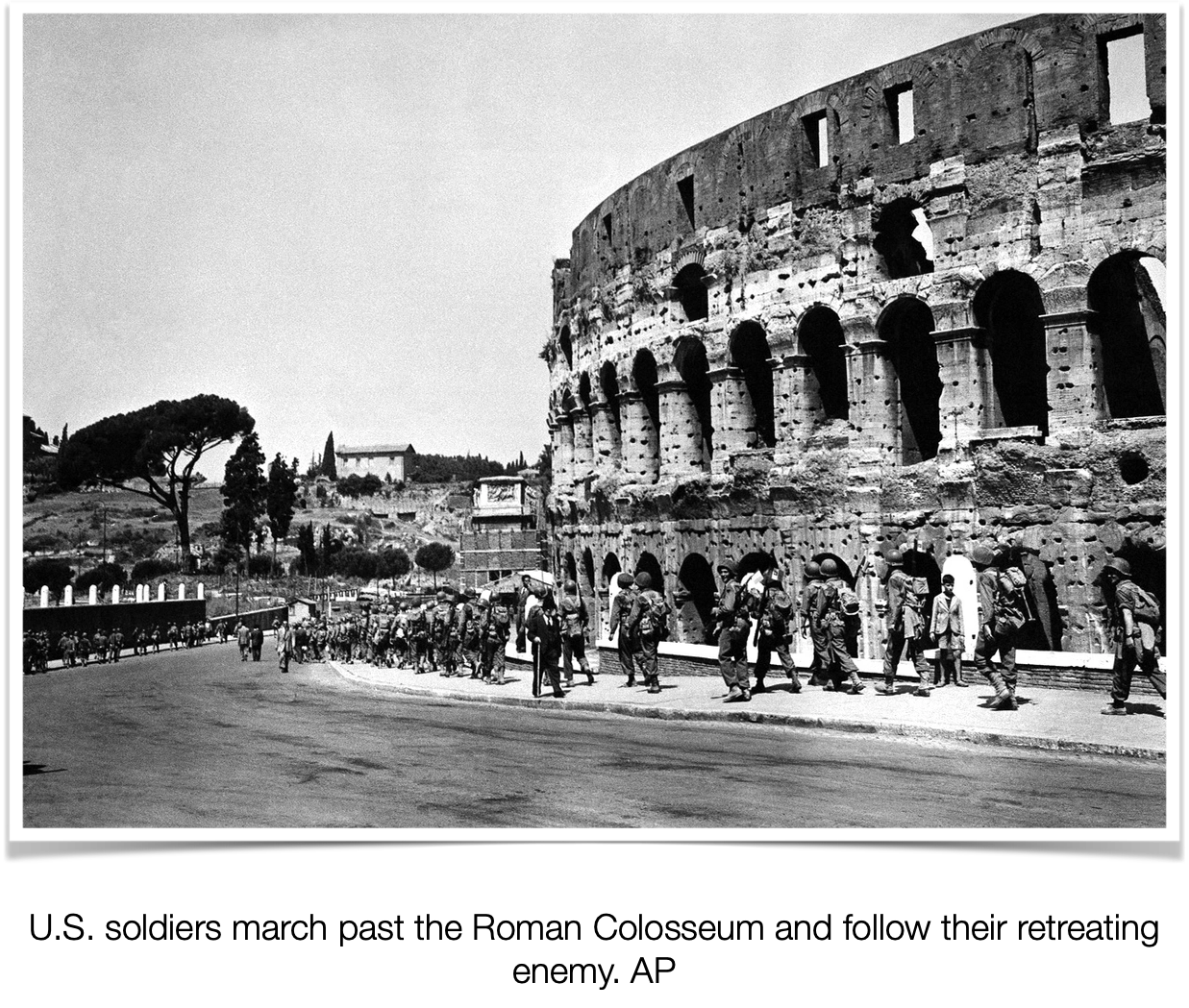 We came by the old Roman coliseum [Colosseum] ruins and several other large old buildings.3 Most of the buildings were made of stone, but some of the buildings were in a decayed state, but this part of Rome didn’t appear to have much war damage. The Germans did not fight for the city of Rome.4 They went on up above Rome and prepared defensive positions there. They often dug or had Italian labor dig slanted slots in the road bank. They could not be seen in the slanted slots there as we approached, but they could pop out firing and surprise us. We always had scouts (point men) go ahead of us to detect ambushes before we walked into them.