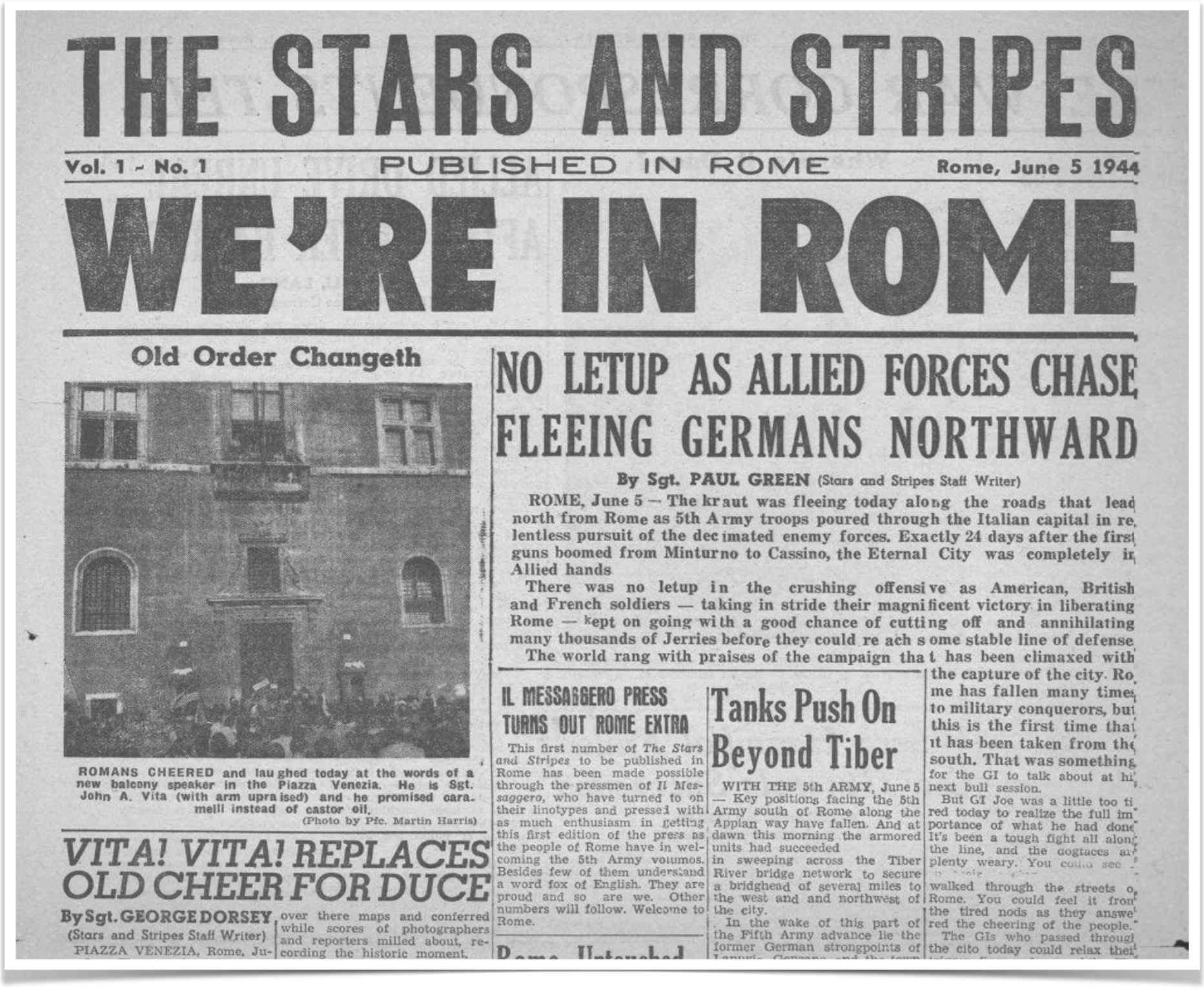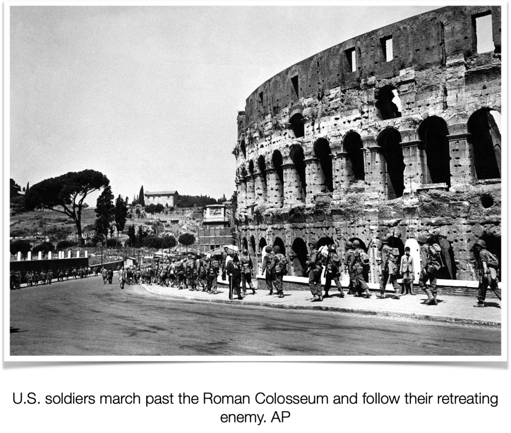 - On June 5, the citizens of Rome were in the streets cheering American troops. However, the soldiers who actually liberated the city had already passed through Rome and were again engaging the Germans along a twenty-mile front. Dad was in the force pursuing the Germans. ↩︎