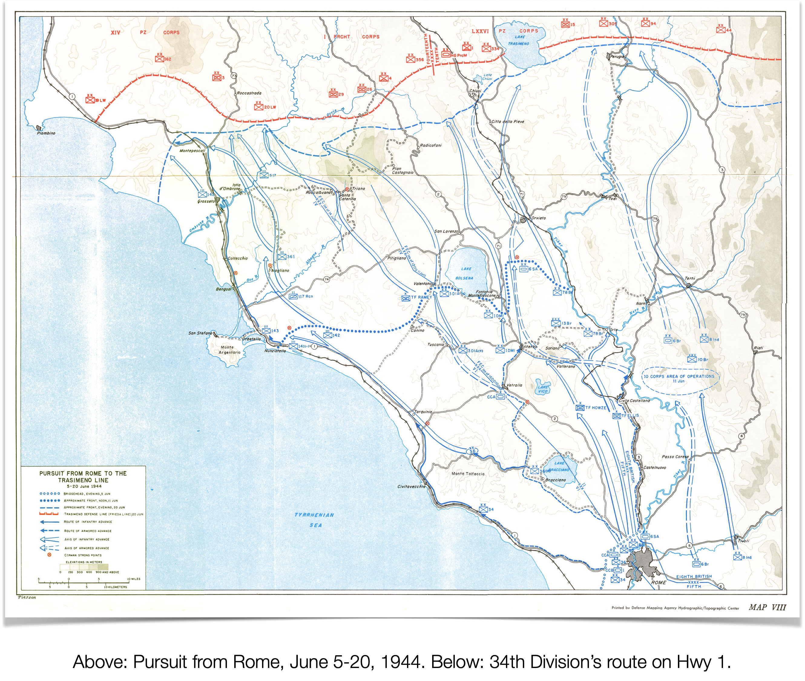 - The Narrative History of the 133rd Infantry places the regiment about 50 miles north of Rome near Civitavecchia. “On 7 June 1944, the regiment moved to the vicinity of Civitavecchia, Italy and the 1st Battalion immediately went into action. The enemy was retreating rapidly, blowing bridges, burning fields and houses in their wake.” Civitavecchia was taken by the 133rd on June 8. ↩︎