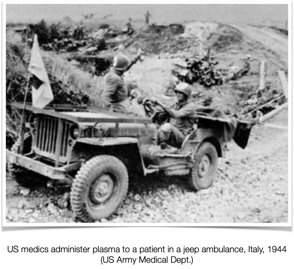 I was put in an ambulance, and we stopped at some other aid stations. Once, a member of my squad was in the ambulance with me. He had a bullet through his foot. He said he saw me get hit, and he got hit from the same machine gun burst. He said that the bullet that hit him came under the tank. I don’t remember much other after that, but I think I had an IV in my arm part of the time. I do later remember being carried up some steps, and a nurse said, “We are going to put you to sleep.” I learned later that we were in Mussolini’s bodyguard troops barracks in Rome. The Americans had made a hospital there.